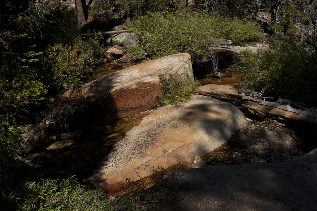 The sound of Snow Creek grew louder and louder as the afternoon progressed. The discomfort from today melted away when I saw it cascading over rocks with plenty of shade. Behind the cascades, I could see a clearing in the woods. I walked back and found a great place to setup camp. A large flat boulder sat near a fire pit, ideal for my sleeping pad and book. The creek filled the air with a relaxing hiss and gurgle.